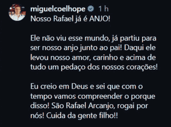 Em uma mensagem comovente, Miguel expressou a dor da família e prestou uma homenagem ao filho. “Ele não viu esse mundo e já partiu para ser anjo junto do nosso pai. Daqui levou nosso amor, carinho e, acima de tudo, um pedaço de nossos corações. Eu creio em Deus e sei que com o tempo vamos compreender o porquê disso. São Rafael Arcanjo, rogai por nós. Cuida da gente, filho!”, escreveu.