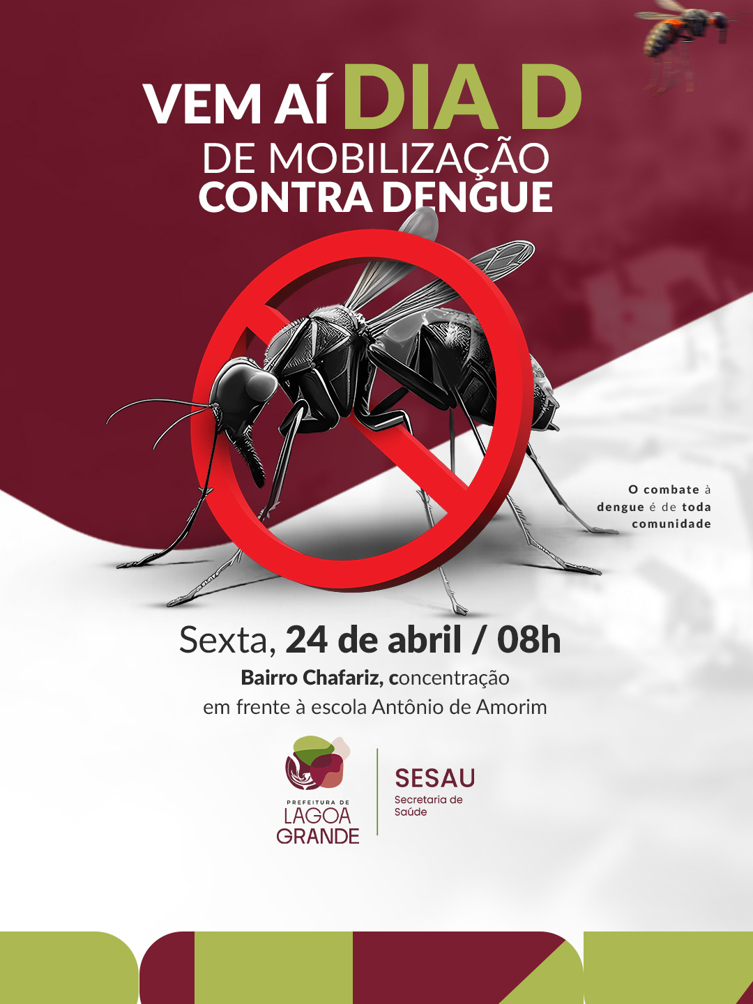 A Prefeitura de Lagoa Grande, por meio da Secretaria de Saúde (Sesau), realiza, nesta sexta-feira (24), o Dia D de Mobilização Nacional Contra a Dengue, no bairro Chafariz, e reforça a importância da prevenção e da participação da população no enfrentamento às doenças transmitidas pelo Aedes aegypti.